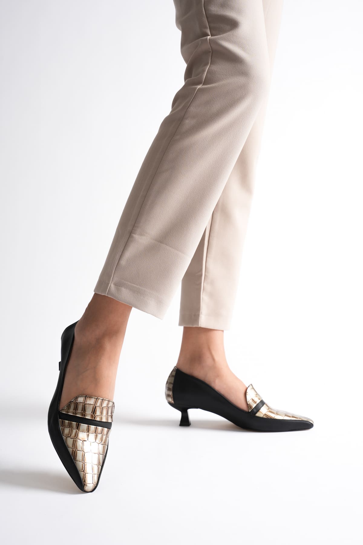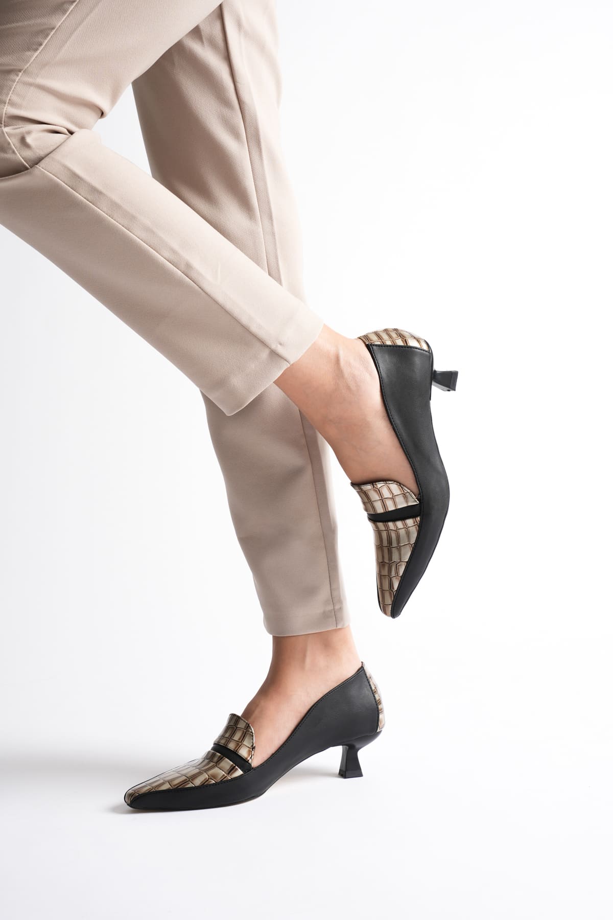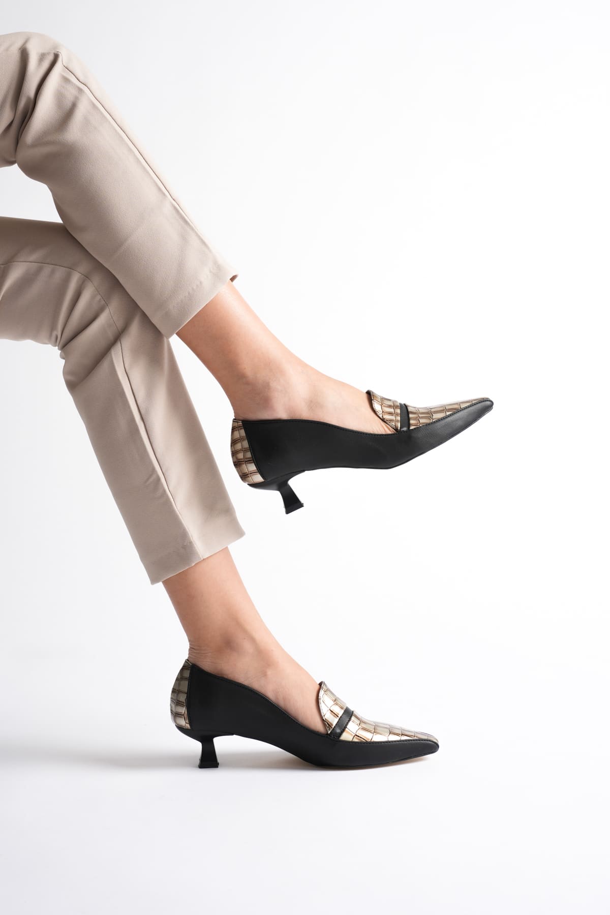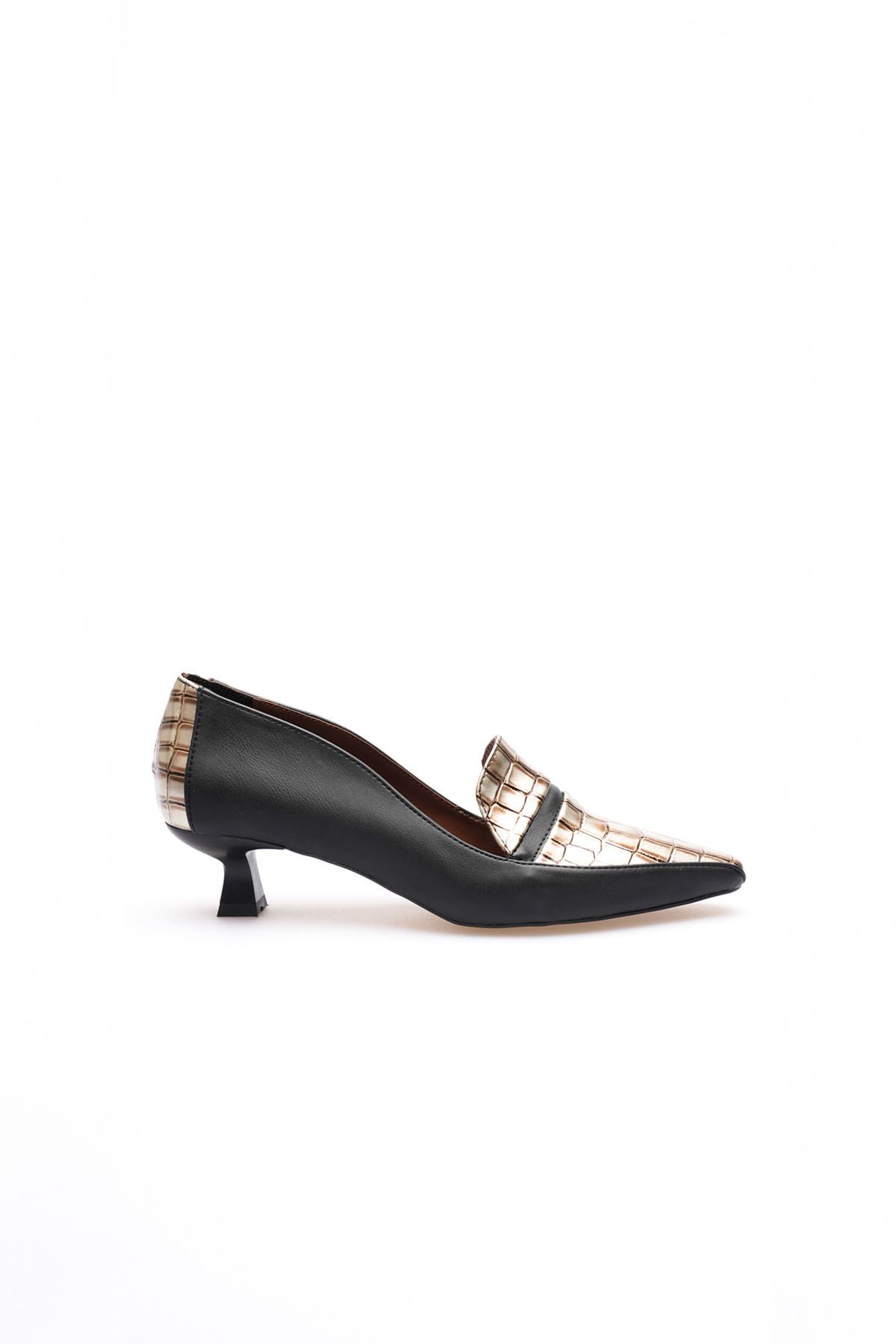 Elsie Kadın Siyah Altın Kroko Kısa Topuklu Ayakkabı